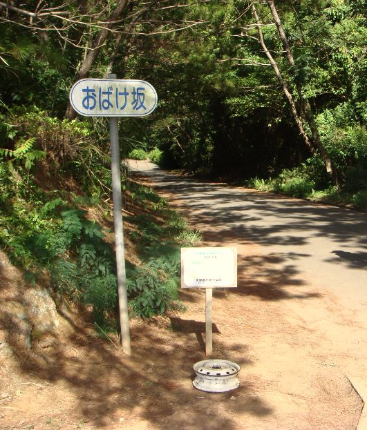 久米島の外周道路に「おばけ坂」の看板が設置されていますが、実際の坂は、その看板より少し奥にありますので、掲載した写真に写っている標識を目印に向かうと場所がわかりやすいと思います。
