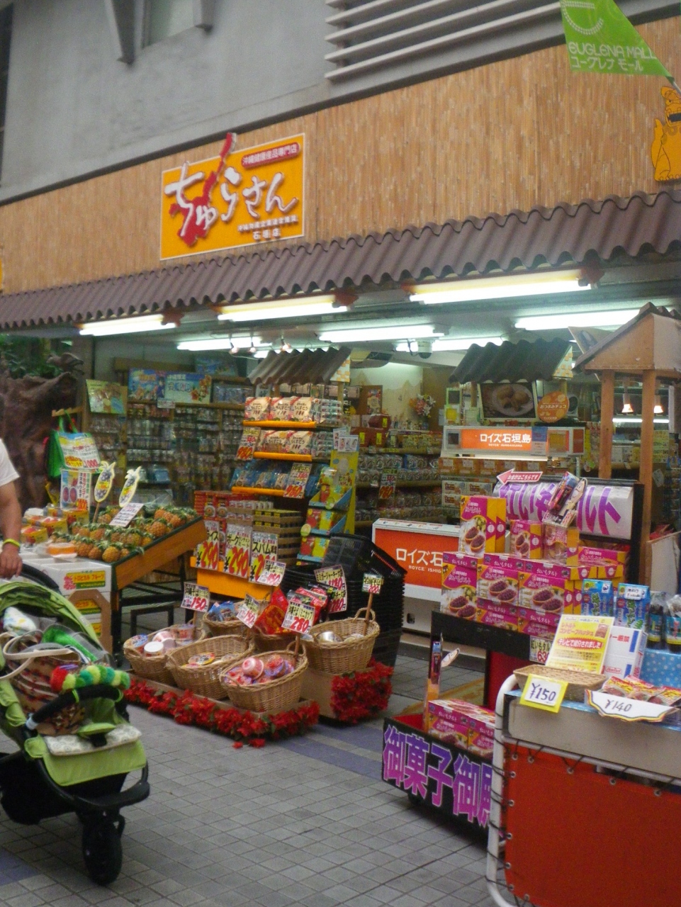 ユーグレナモール中央通りにあるお土産店です。ロイズ石垣島や御菓子御殿の紅芋タルトのコーナーがあり、どちらかというとお菓子系を多く扱うお土産店です。石垣パイナップル、もずく、海ブドウ、スパム缶詰、沖縄そばカップ麺など、スーパーっぽい品揃えが面白いです。