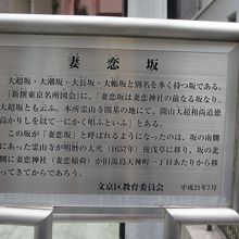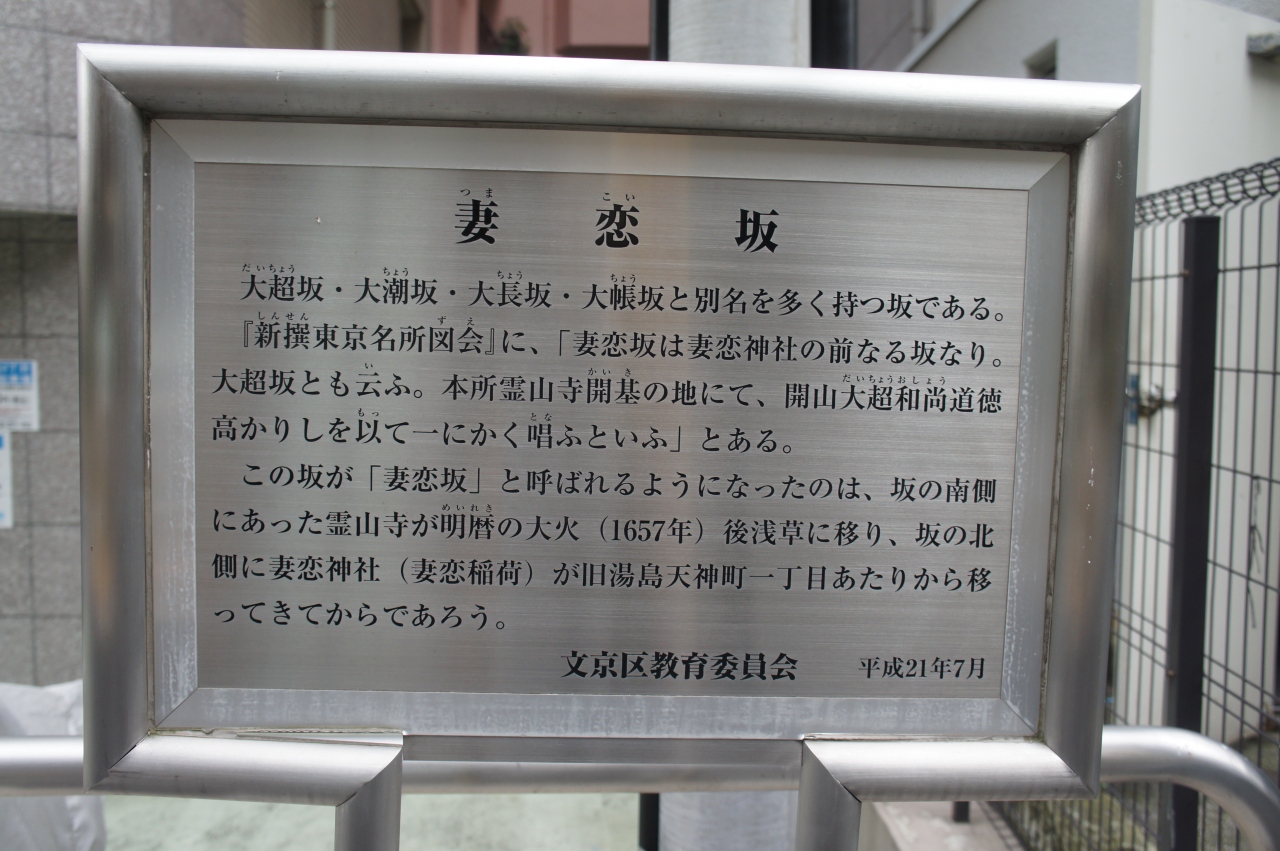妻恋坂は、日本武尊とその妃を祀る妻恋神社から下って行く坂。坂には、案内板が立っていて、けっこう詳しい説明がありまして。大超坂、大潮坂、大長坂、大帳坂など別名がたくさんあることや明暦の大火で妻恋神社がここに移ってきたことなどが書かれていました。
