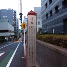 市ヶ谷駅近くの細い裏通りに「帯坂」の案内表示がありました。