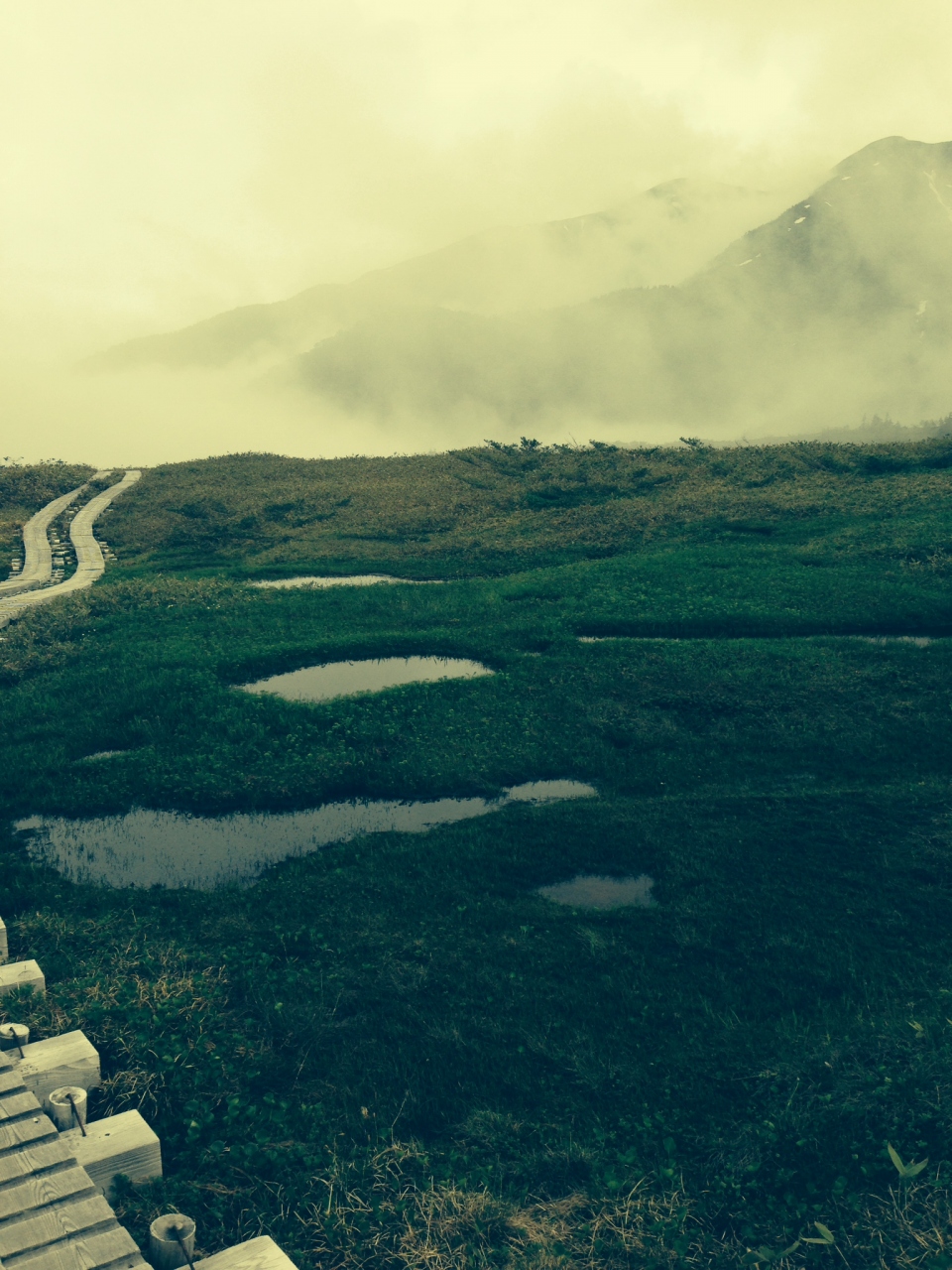 美しい湿原の背景には霧の立ち込める大日連山の神秘的な景色が広がっていました。