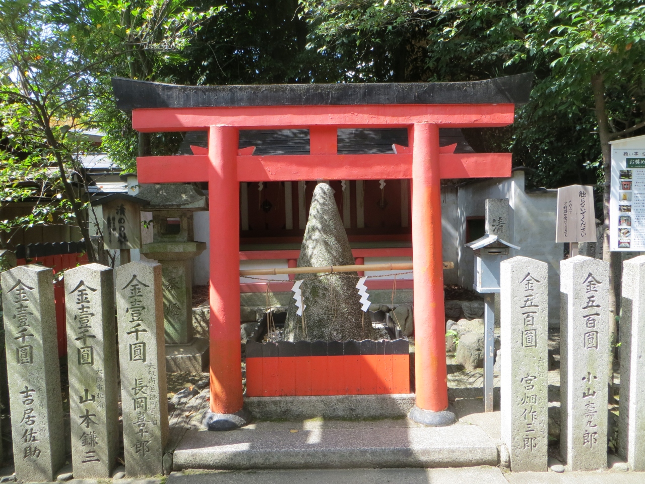 嵐電車折神社駅の南口を降りるとすぐ車折神社の裏参道の鳥居があります。表参道は三条通から入るルートです。鳥居をくぐり本堂の方へ石畳を少し歩くと右側にとても素敵な社があります。小さめの朱色の鳥居の後ろに三角錐の大きな石が鎮座しています。悪運を浄化する石だそうです。