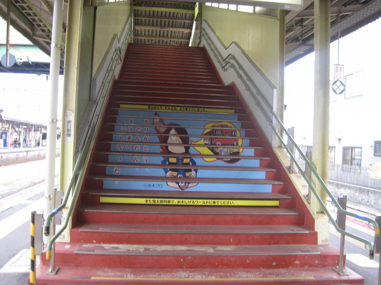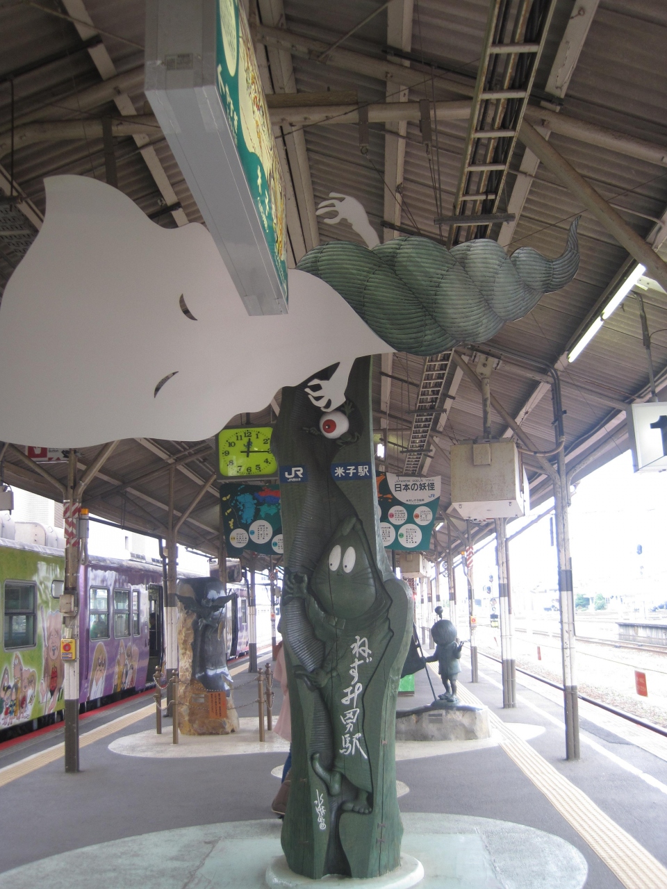 駅自体は普通なのですが、改札をくぐって境港行きのホームへ行くと妖怪がお出迎えしてくれます。別名ねずみ男駅。停まる電車も鬼太郎電車で徹底されています。