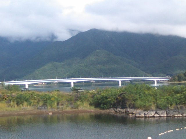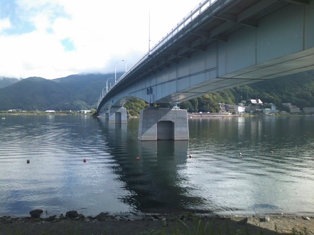 河口湖に架かる立派な橋で、結構な長さを誇っています。日本の道100選にも選ばれているようで、橋の袂にその碑が誇らしげに建てられていました。通行しながら眺める富士山や湖畔の山々の風景も最高ですし、下から眺める橋の景観もとても絵になり、河口湖を代表するスポットの一つだと思います。