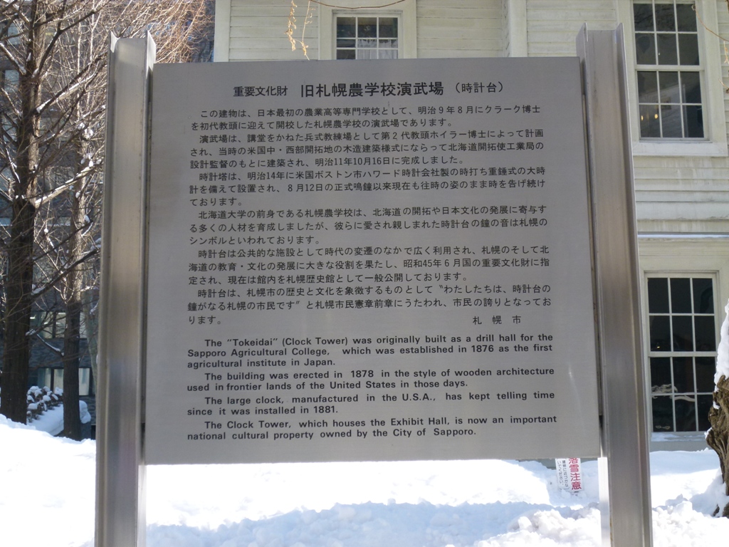 「旧札幌農学校演武場」とは、札幌市時計台の正式名称ですが、別物と思っている方が大半ではないでしょうか。演武場から始り、さまざまな施設として市民に愛されています。「札幌市時計台」の口コミ評価が 4.5 で、この「札幌農学校演武場跡碑」の評価が 3.0 と言うのは残念です。