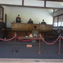 明治村の5丁目にある施設です。建家自体は、和風の平屋建ての建物ですが、中に法廷の様子が蝋人形で再現されていて、とてもリアルです。弁護士・検事・裁判官の姿があり、明治時代には、すでにこんな民主的な裁判が行われていたのには驚きです。
