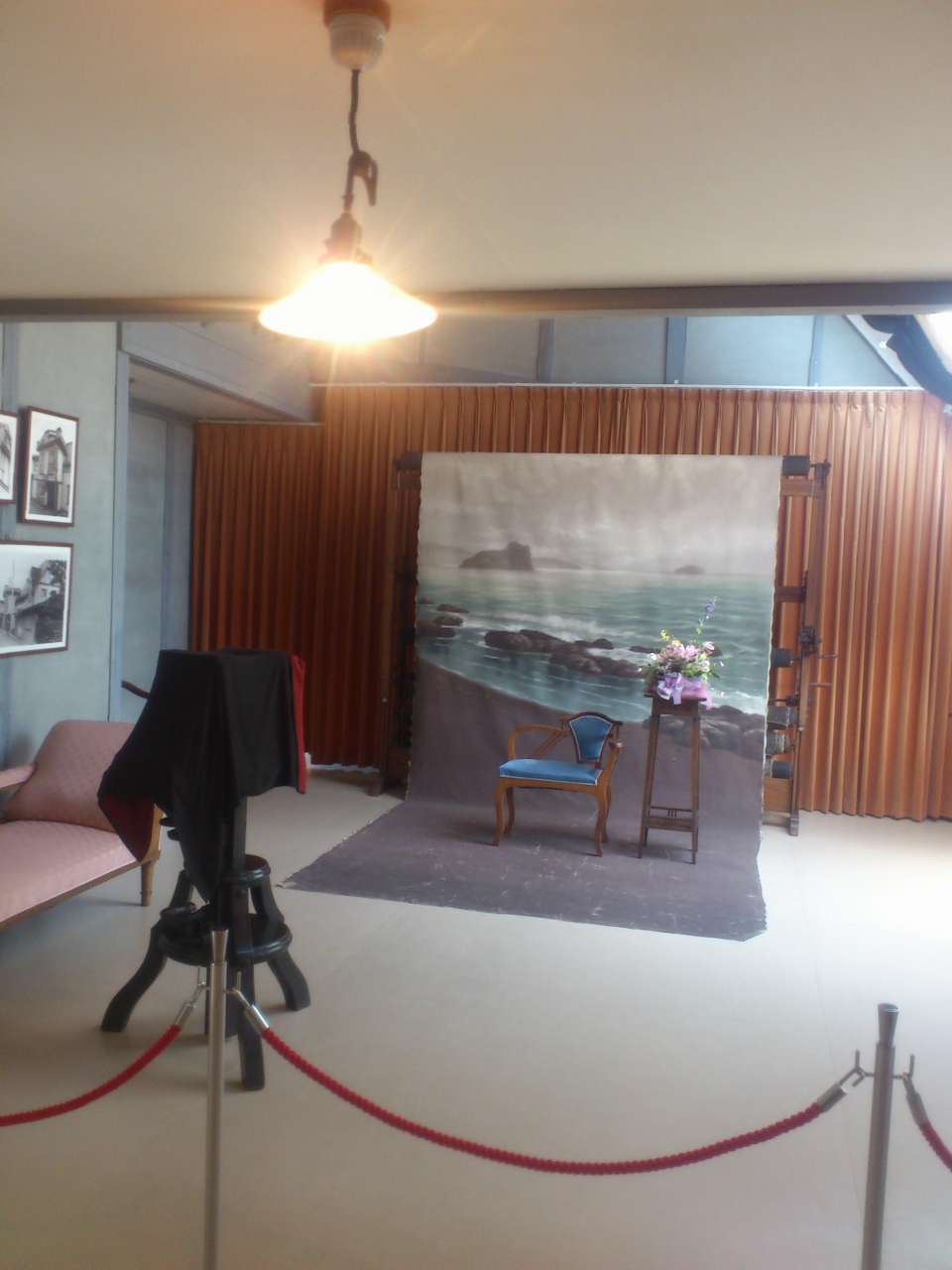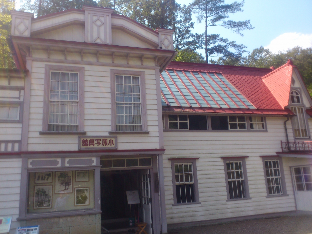 明治村の5丁目にある、赤と白が特徴のかわいい洋館の建家の写真館です。新潟の上越市から移築したようです。明治時代なのに、新潟にこんな個人が建てた洋館風の建築物があったとは驚きです。靴を脱いで、建物の中にも入ることが出来、1Fは居住区で、2Fに撮影所があります。