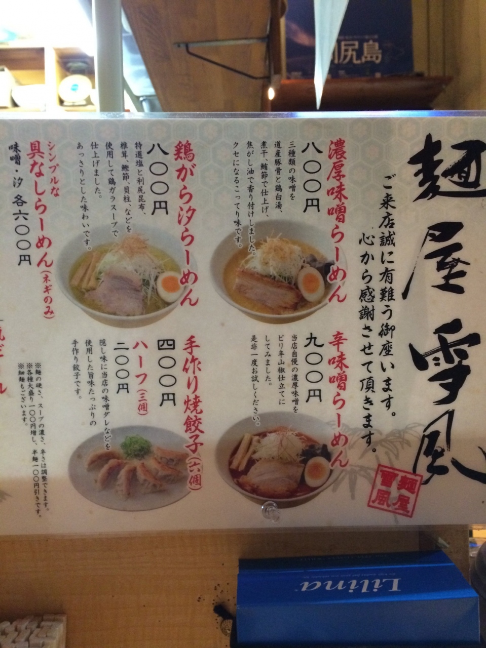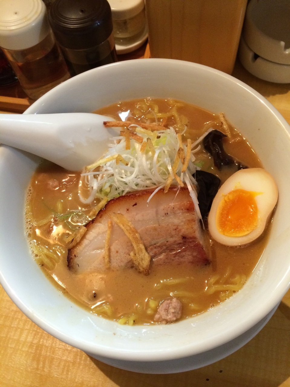 なにかのランキングで上位だということで行ってみました。21時過ぎくらいだったと思いますが、すでに五名くらい並んでいました。店内に入ると、座席はカウンター約10席とテーブル席が少しあるだけ。芸能人のサインが貼ってあって、期待も膨らんだところで注文した味噌ラーメン登場。さっそく一口、んっ?とくにパンチも特徴もないあっさり味。あれ?これでランキング上位?と思いましたが、飲んだ後にはいいかもしれません。