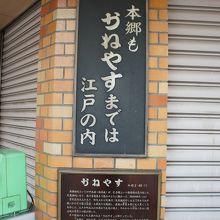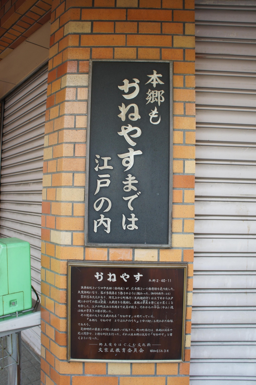 かねやすは、本郷三丁目の交差点、角の雑貨店。日曜日なので店は閉まっていましたが、有名な川柳だという「本郷も かねやすまでは 江戸のうち」という看板があります。