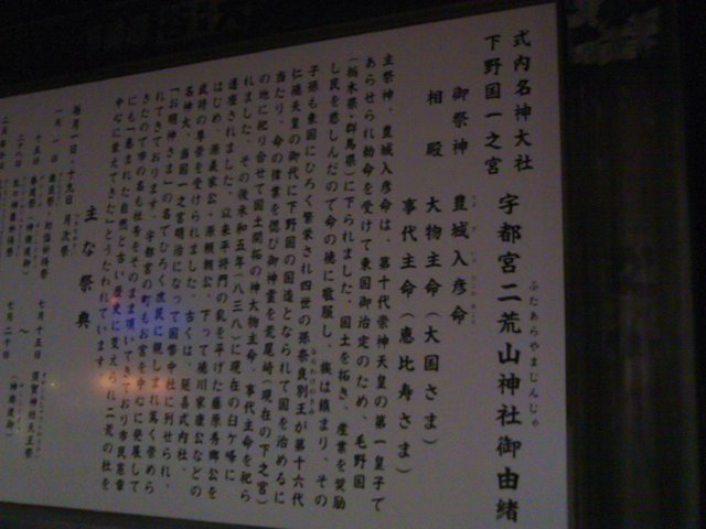 ここは宇都宮を代表する観光地ですので、今回、東京から終電で到着した後、深夜でも何某かの照明などで拝観できるのでは、と期待して、午前2時頃に足を運んでみましたが、期待に反して付近は真っ暗で、何も見ることが出来ませんでした。こんな時間に足を運ぶ方は稀かとは思いますが、基本的に夜に行く場所ではないです。(初詣時期などは勿論別の印象かと思いますが…。)