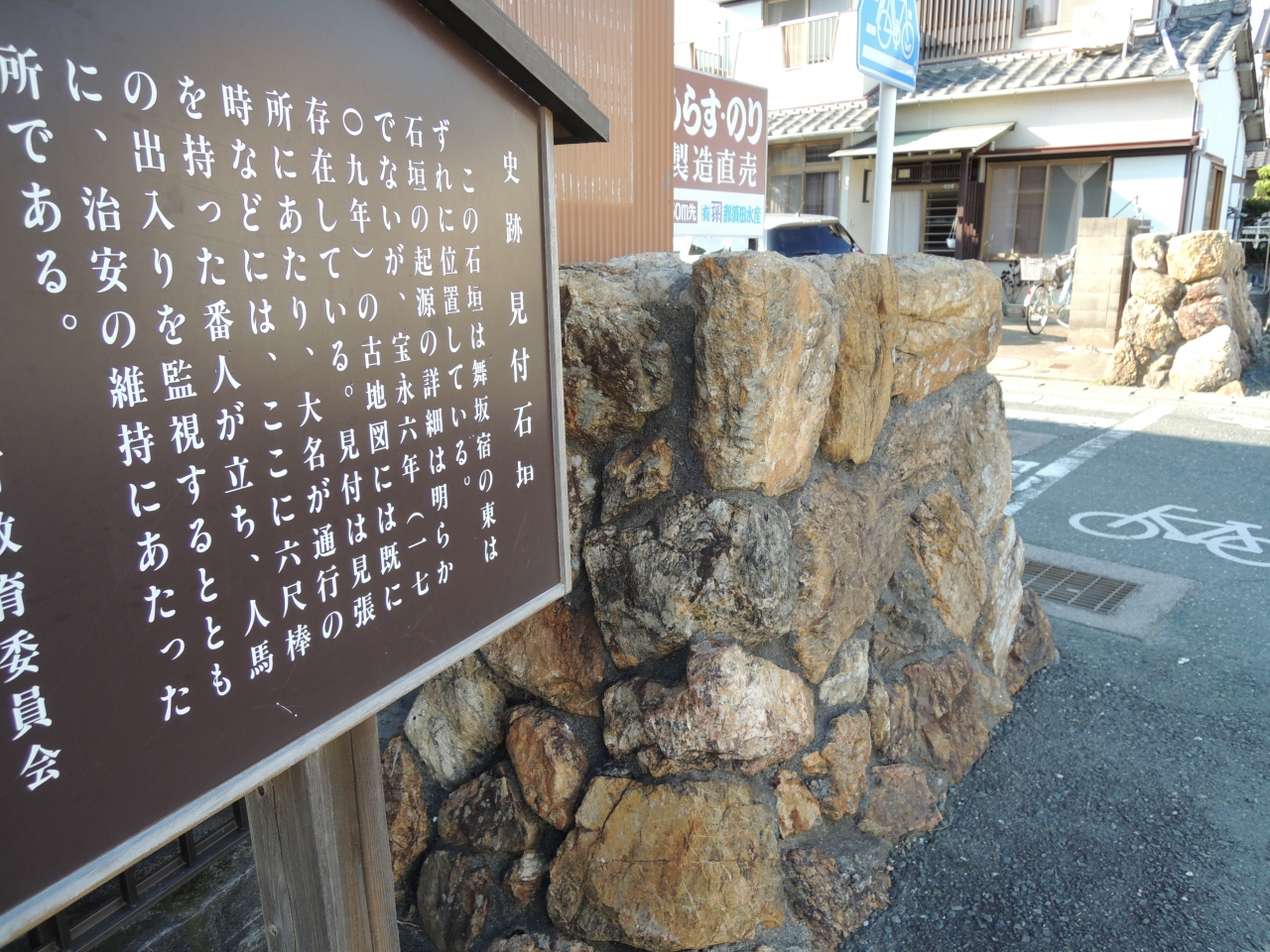 旧東海道を脇本陣から松並木方面に歩いていくとある見付石垣は江戸時代中頃に街道の脇に造られた見張所の跡とのことです。諸大名が通行する際には、石垣の横に六尺棒を持った番人が立って人馬の出入りを監視し、治安の維持にあたったところだそうです。