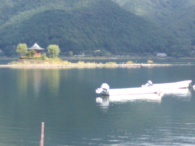 河口湖南岸の八木崎公園付近から、沖合にお堂のようなものが見えたので何かと思ったらこちらの六角堂でした。平時は海に浮かぶ小さな島の上に建てられていますので、船がないと到達できないようですが、頻繁にお堂に行く船舶の姿を見かけましたので、信仰や観光で訪れている方は多いような印象を受けました。