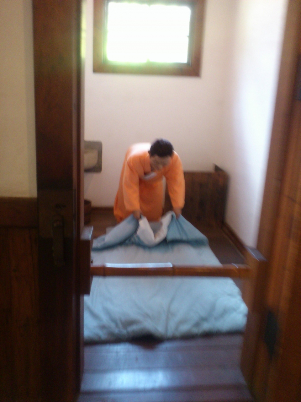 明治村の5丁目にあります。近くに同じ監獄の前橋監獄があるので、比較すると面白いです。こちらの金沢監獄は、八角形の中央看守所があります。重要文化財に指定されています。この中央看守所から八方へ監獄棟が続いていますが、実際は1本の監獄棟があるだけです。残りは監獄棟の絵がはめてあるので、とても広く感じます。監獄棟では、監獄に囚人の人形が飾られていたり、当時の監獄の食事がおいてあります。