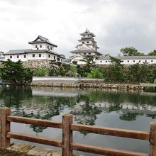 水鳥が泳ぐお堀に囲まれて建つ天守閣は、下の幅が広く、徐々に上の方が細いというよく見るタイプではなく、全体的にひょろっとしたフォルムで、なんだか頼りない雰囲気です。