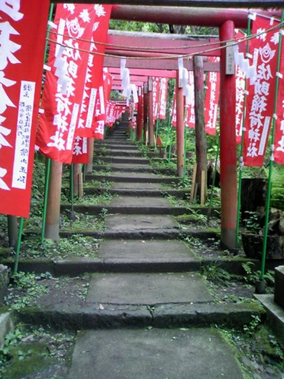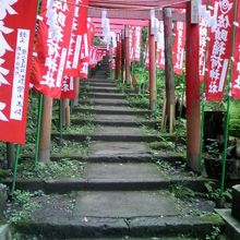赤い鳥居と旗が続く