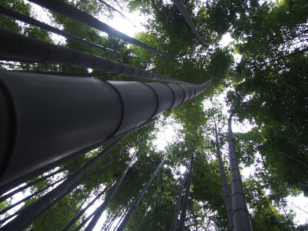 立派な竹林です。山にある竹しか見たことがなかったのですが、綺麗に手入れされた緑色の竹は美しいですね。見上げると、遠くに空が見えます。そんな景色も美しい。