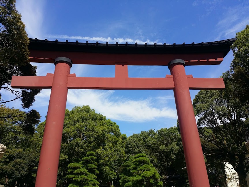 非常に大きな鳥居をくぐると、左手には池があり、正面に大きな神社がそびえています。