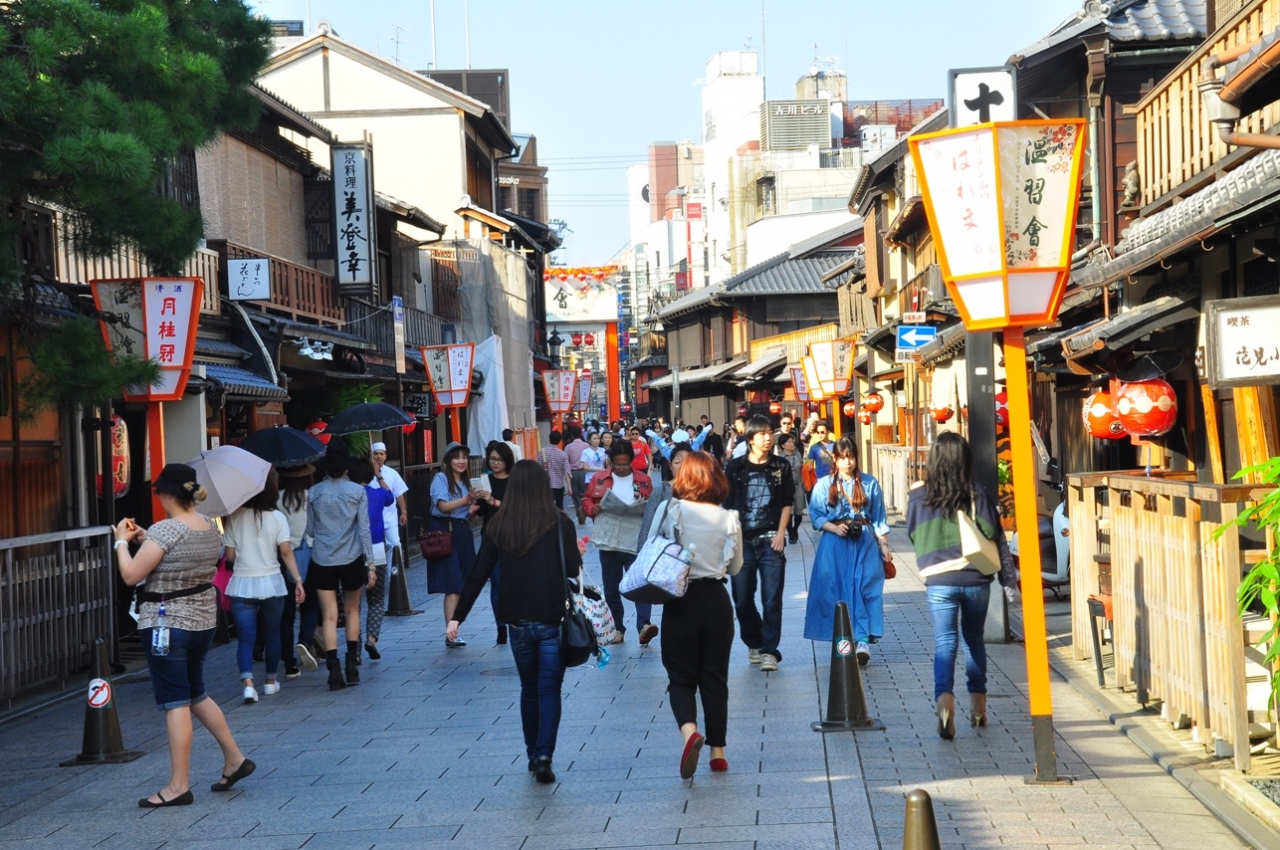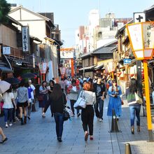 四条通の繁華街や八坂神社からも程近い場所に有ります。時代映画のセットのような町並みで、多くの観光客で賑わっていました。通りの両脇には京料理屋や土産物店などが軒を連ねています。歩行者天国になっているのかとも思ったのですが、車両も通行するようで、人通りの多い場所や路地との交差点には、交通整理の警察官が配置されていました。脇にある路地も、良い雰囲気出しています。