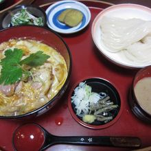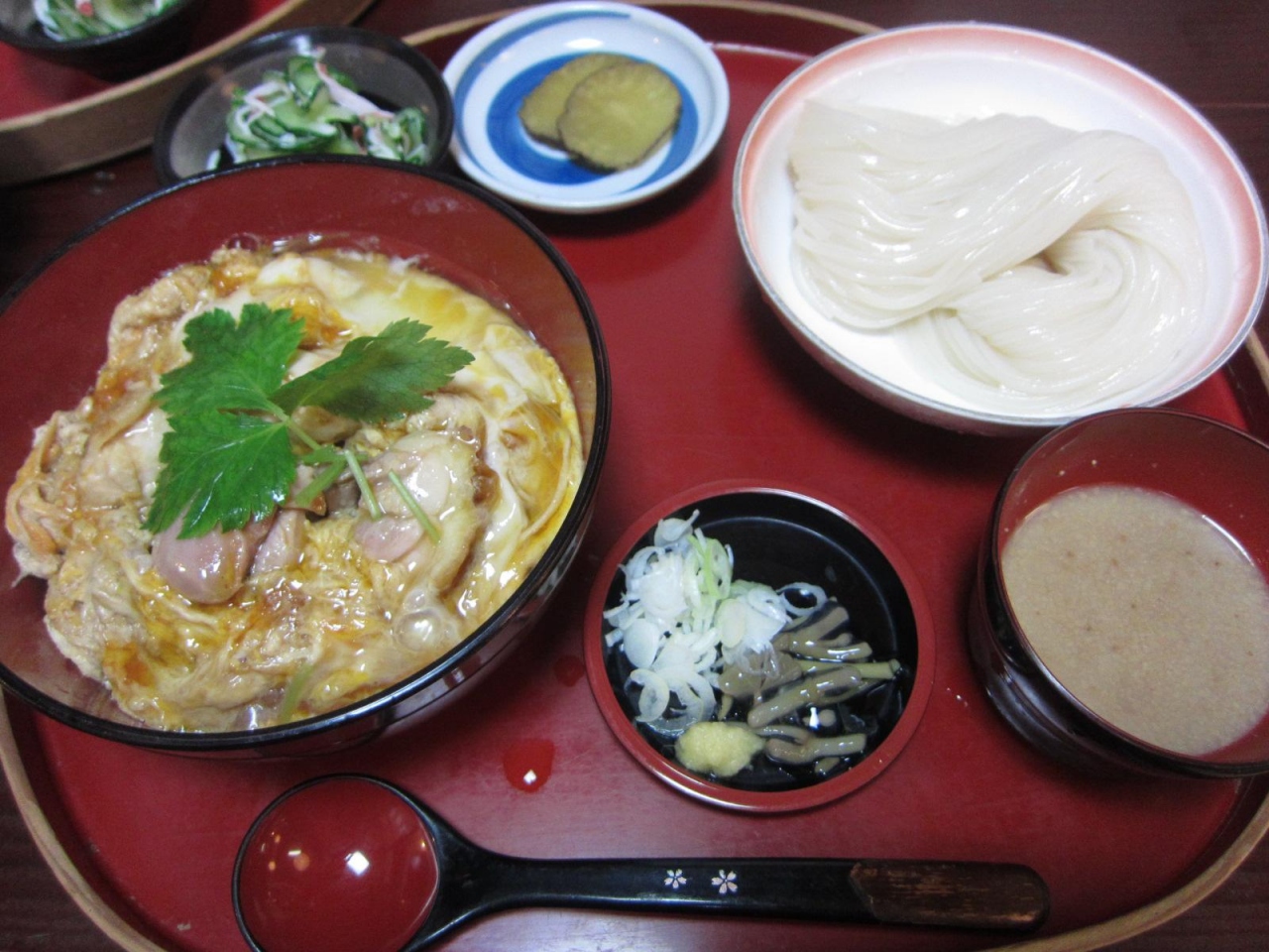 比内地鶏親子丼と稲庭うどんのセットで1600円ちょっと。両方量が少ないとお店の人はおっしゃっていましたが、親子丼は一人前だと思うような量でした。稲庭うどんは温かいものと冷たいもの、冷たい方はたれをしょうゆとごまから選べます。おススメをきいたところ、ゴマだれはこのお店オリジナルということでゴマにしました。しょうがを入れて食べるとすっきりしておいしかったです。両方を食べたのであきずに食べられてよかったです。
