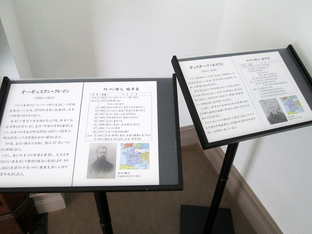 「旧開智学校」横にある可愛い色合いの小さな洋館です。カトリックの布教のためにフランスから来日し、松本に滞在した司祭オーギュスタン・クレマンさんが明治22年に設計・建設した建物であるとの紹介がありました。建物内に残された貴重な家具類は2つしかありませんが、応接間・食堂・寝室・炊事場などの間取りが残されており、布教活動中の質素な生活ぶりが伝わってきました。
