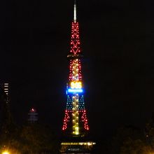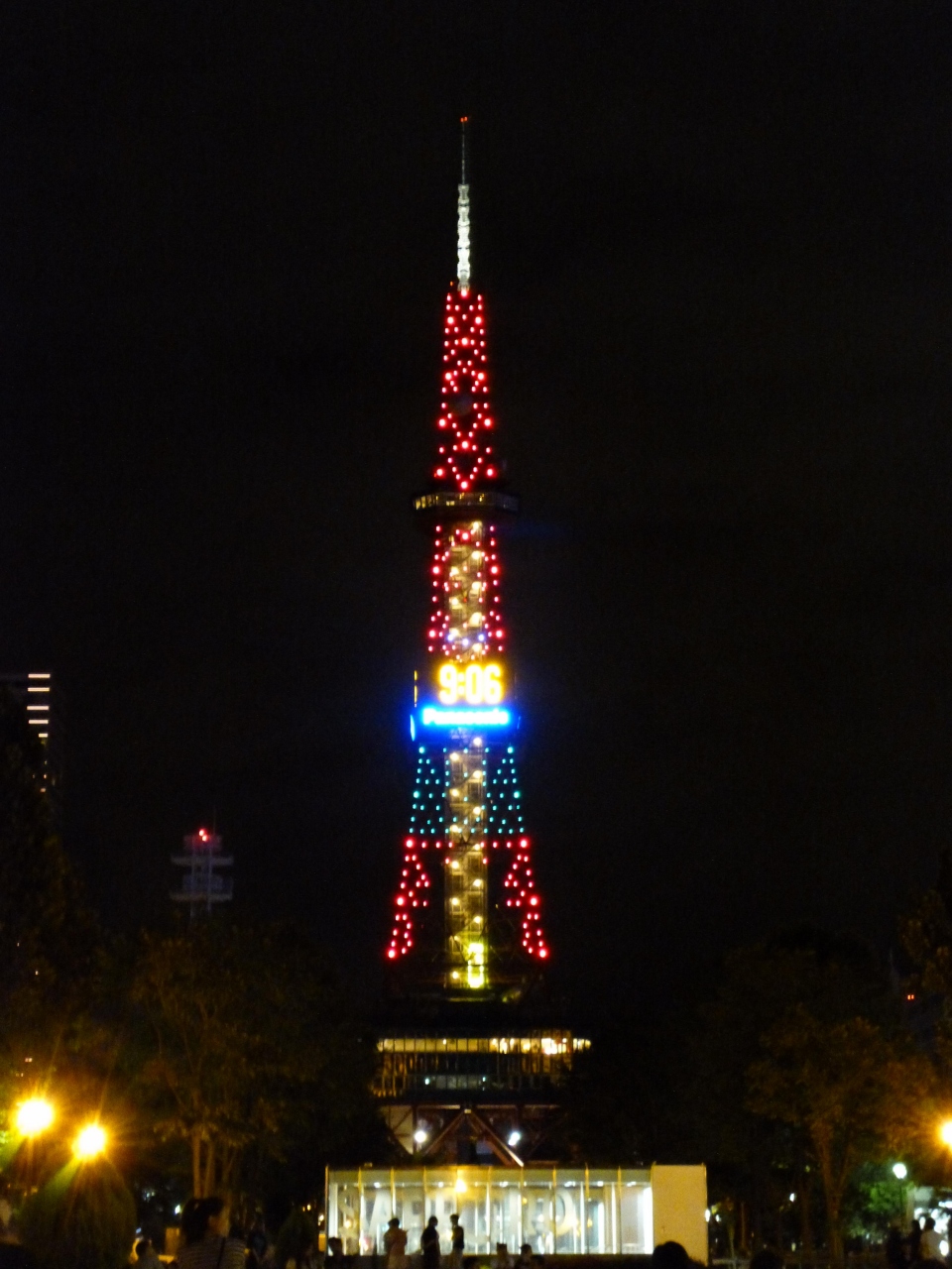 夜、時計台を見に行くときれいにライトアップされていました。さまざまな色が点灯していて、時間がたつとそのパターンも変わっていきました。すこし見ているだけでたくさんの組み合わせを楽しむことができました。