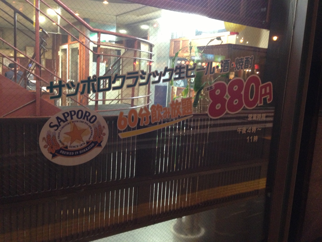 札幌の狸小路にある居酒屋です。こちらは、なんといってもコスパが最高。刺身も、値段を考えればなかなかレベルの高いものを頂けます。サッポロクラシックも含んだ飲み放題が880円と、大変お得。突き出しも、セルフで一皿盛り放題。