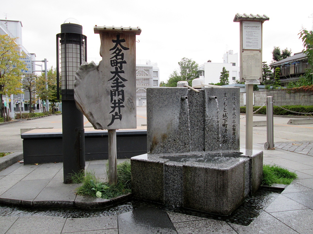 松本市にとって、綺麗な水の存在は重要な観光資源の一つです。そうした水の存在を具現化するため、市街地各所には意匠を凝らした井戸が設けられています。この井戸のある場所は、その名前の通り、かつて松本城の大手門があった場所になります。
