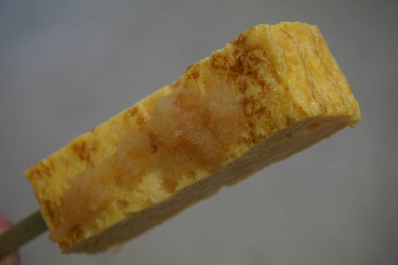 築地には、有名な玉子焼のお店がいっぱいあるんですが、この山長は串に刺した厚焼き玉子があって、すごい行列でした。お好みで、大根おろしをトッピングしてくれます。で、玉子の方なんですが、玉子の中の方にも、ところどころつるんとした食感があって、これって、やっぱりプロの技なんですけねえ。ちょっとサプライズのある玉子焼きです。