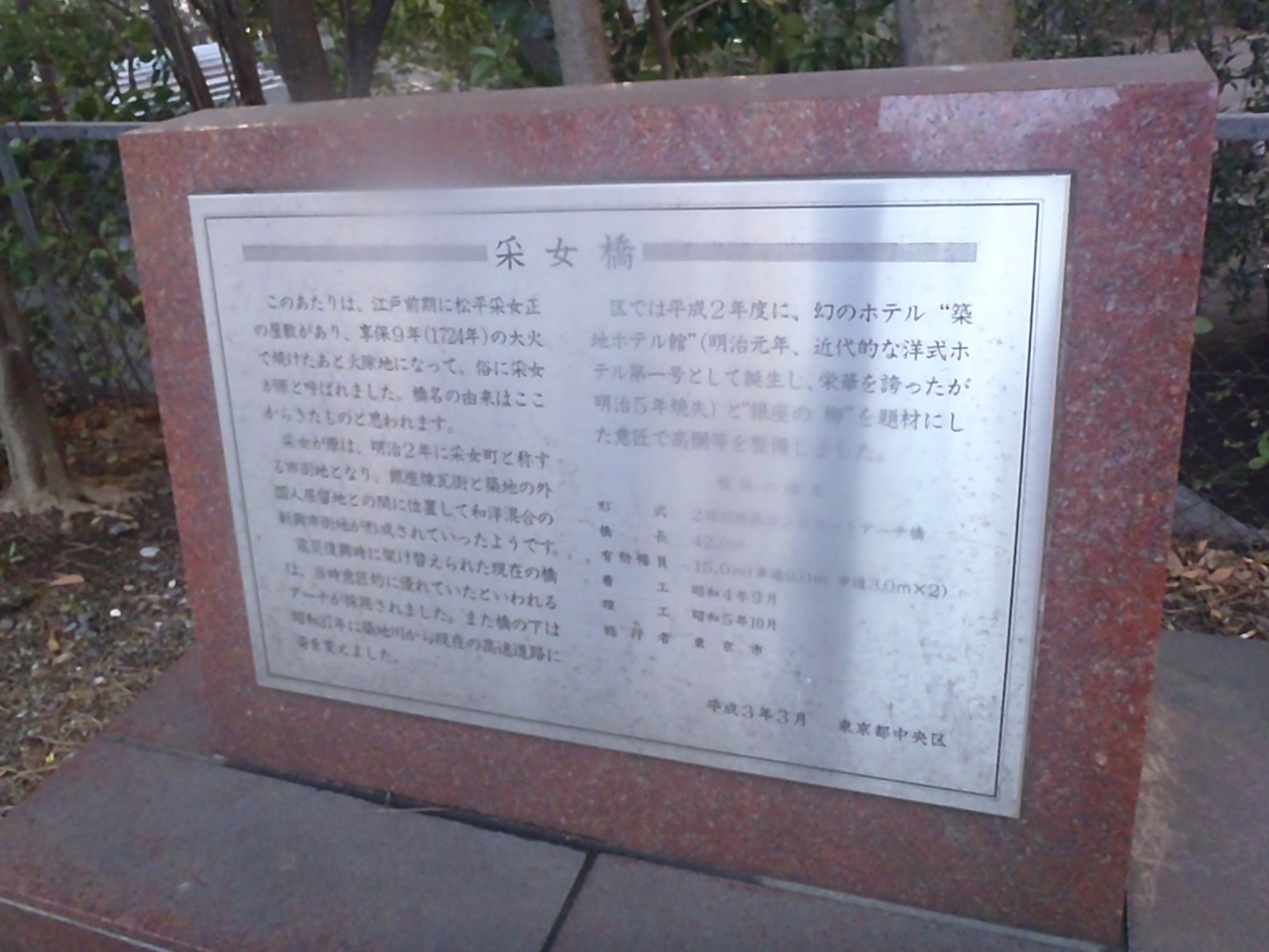 橋にある案内板によると、江戸前期ここには松平采女正の屋敷があった為名付けられたそうで、享保大火で消失後は火除地になり、橋の下は昭和17年築地川を埋め立てて首都高速になっています。
