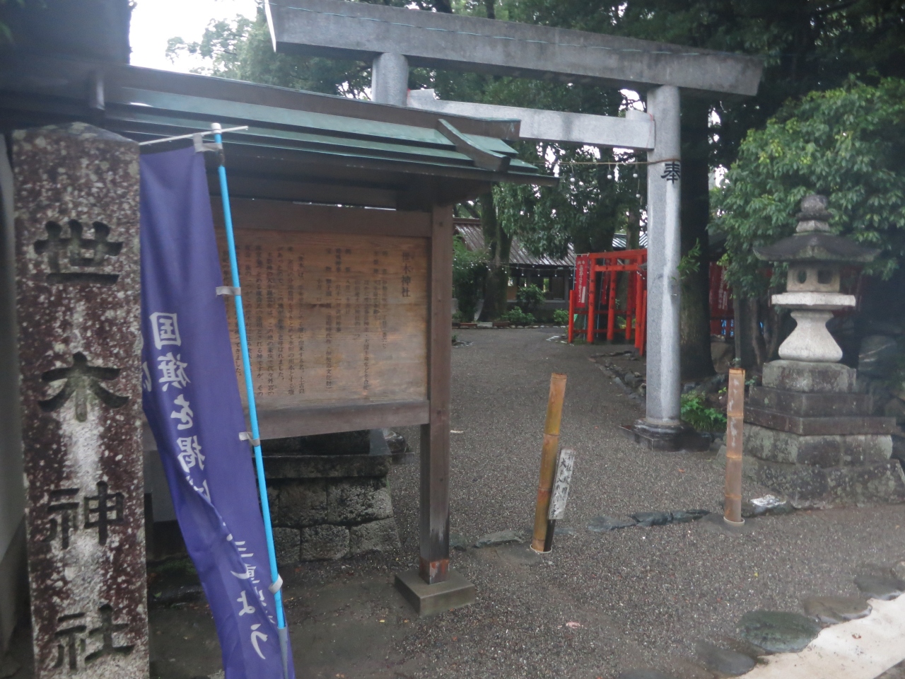 JR伊勢市駅正面改札を出ると左手に日本酒の大きな看板がある小さな森が見えます。この森が世木神社です。看板には「世木」は水をせき止める堰に由来し、天牟羅雲命、大国主命、菅原道真公等の多くの祭神が祀られています。