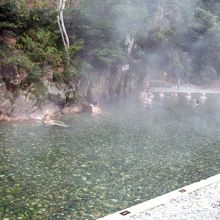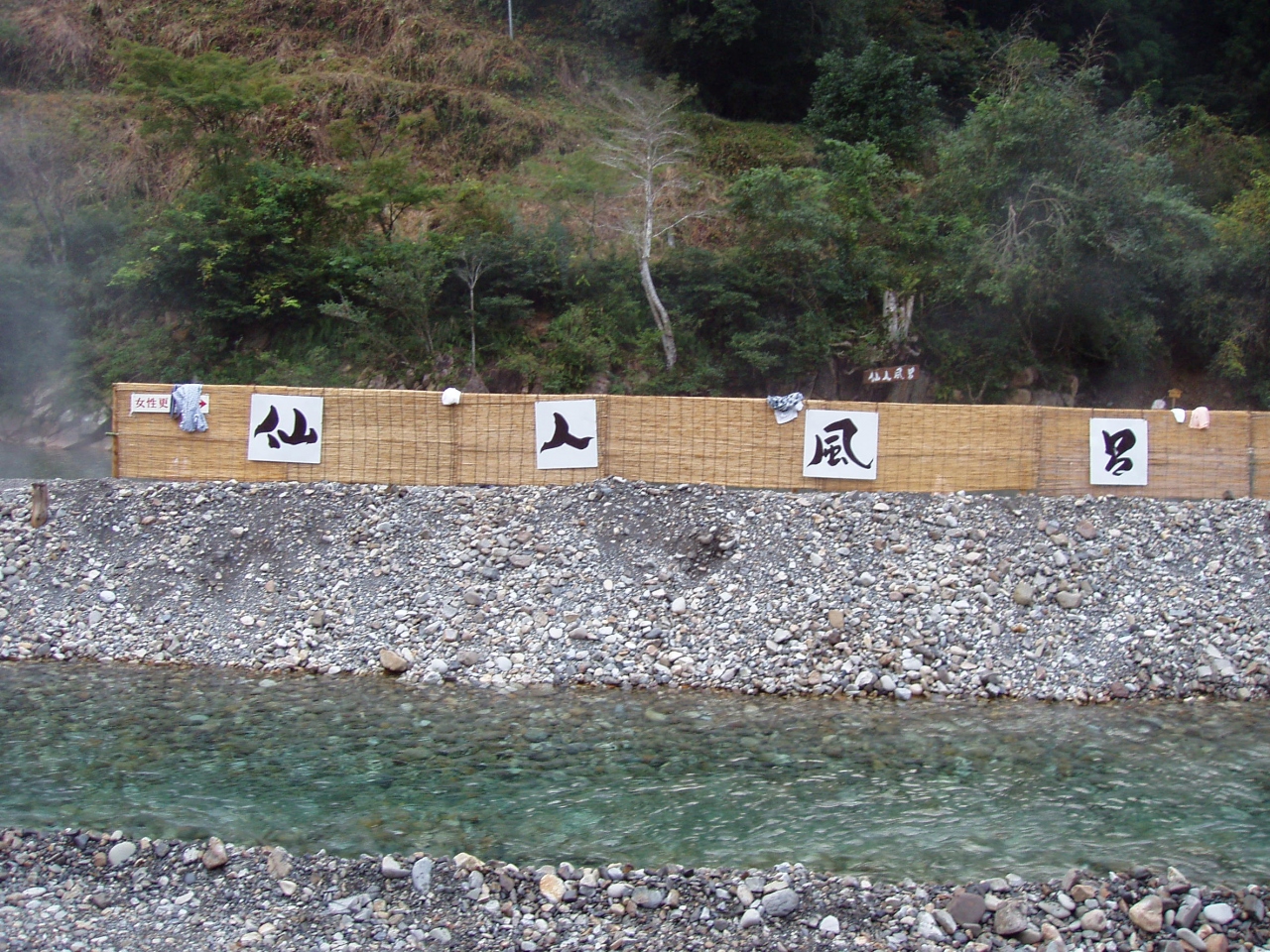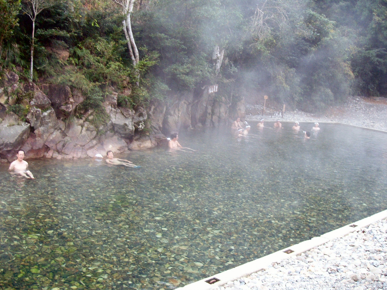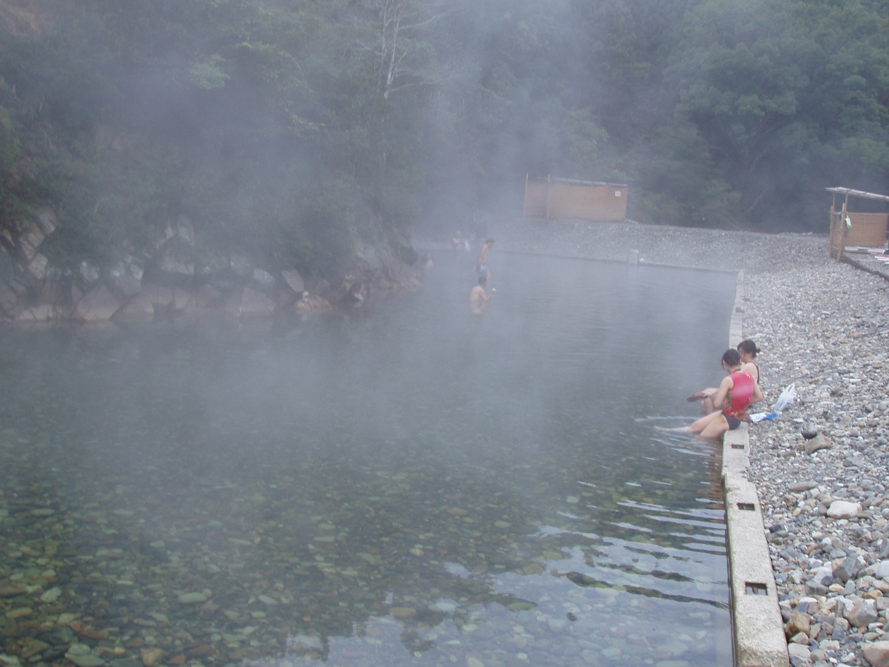 民宿で着替えてかねてから聞いていた仙人風呂(露天風呂)に向かう。民宿で水着を借りようとしたが夜だから水着なんか着なくてもいいですよと言われてタオルだけを借りて徒歩5分。既に20人位の入浴者(内女性 5人程度)あり。風呂は川を一部せき止め川原を掘れば温泉が出るため川の水で温度調節をしている。夜風にあたってゆっくりと入浴。湯の出るところに入らないと冷たい個所もありました。