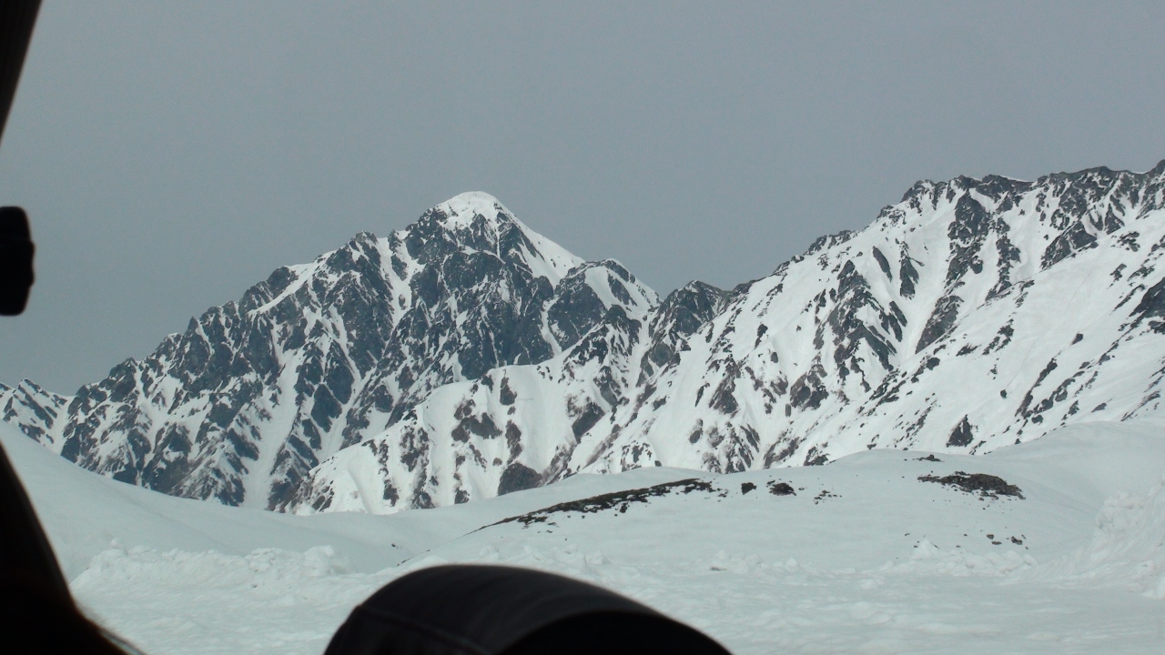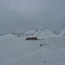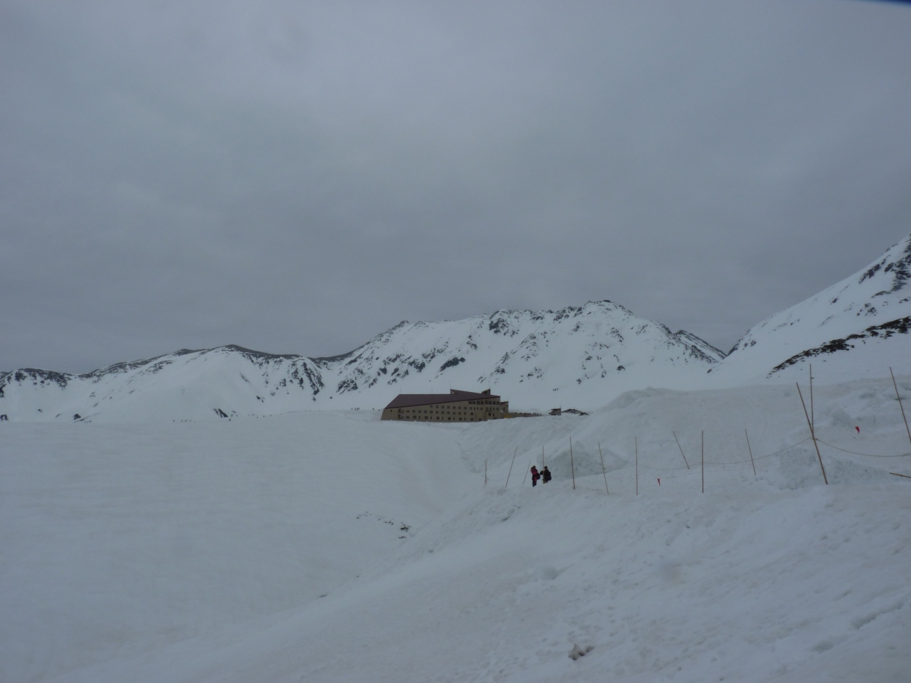 大観峰を立山トンネルトロリーバスで約10分ほど乗ると室道に到着。ここは標高2450Mあり、すぐ前にはホテル立山がある。ここからの眺めは壮大で雪を冠った立山連峰が眼前に広がり、4月といえども残雪は4Mを下らないと言う。まぶしいくらいの残雪の上で戯れる観光客が大勢!