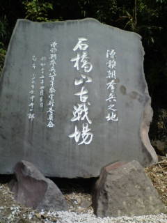 小田原からバスに乗り、石橋で下車して、道なりに東海道線のトンネルの上に行くと、立派な「石橋山古戦場」の碑があった。少しのぼると討ち死にした佐奈田与一を祀る佐奈田霊社があった。神社なのか寺なのか、両方合わせもつ立派なものだった。