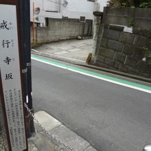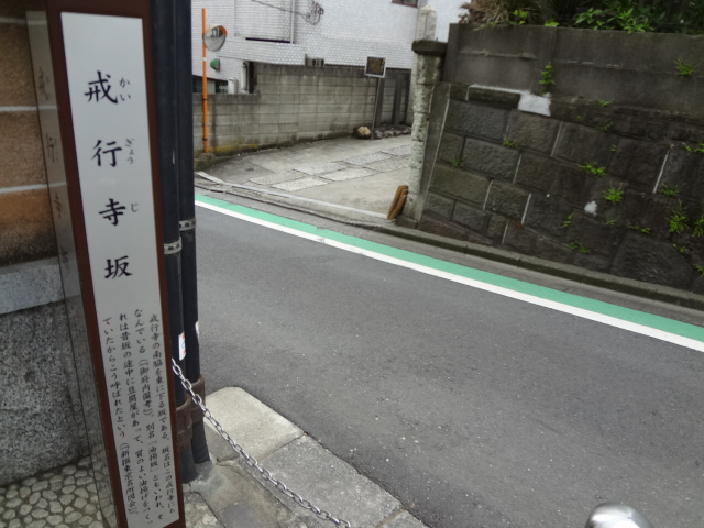 外苑東通りの左門町の交差点から東に延びる小道をどんどん進むと、「戒行寺坂」の表示板が目に入りました。当然のことながら、近くにあるお寺の名前にちなんだ坂なのですが、別名「油揚坂」とも言われているそうです。これは近くに豆腐屋があったことにちなむことらしいです。