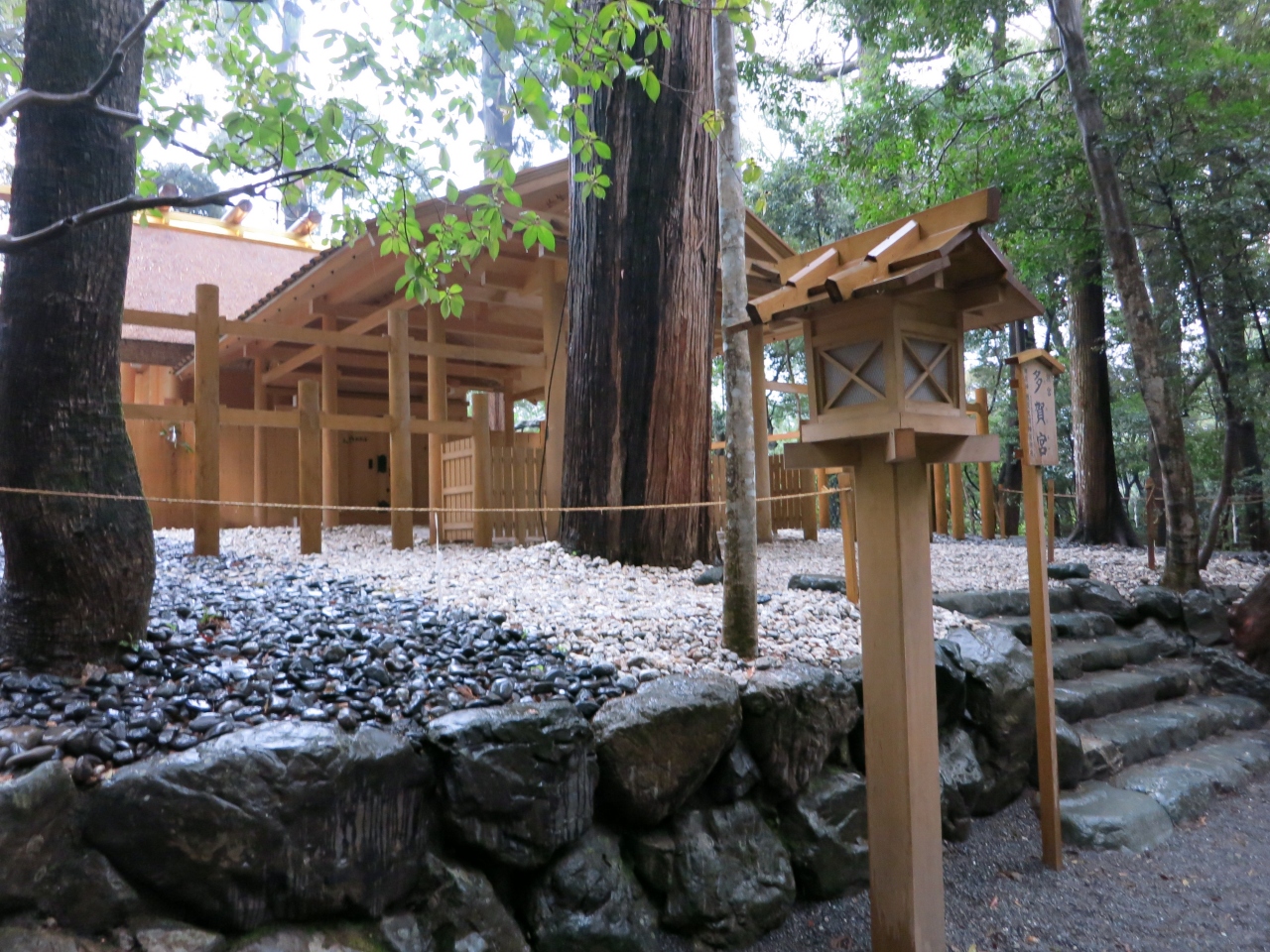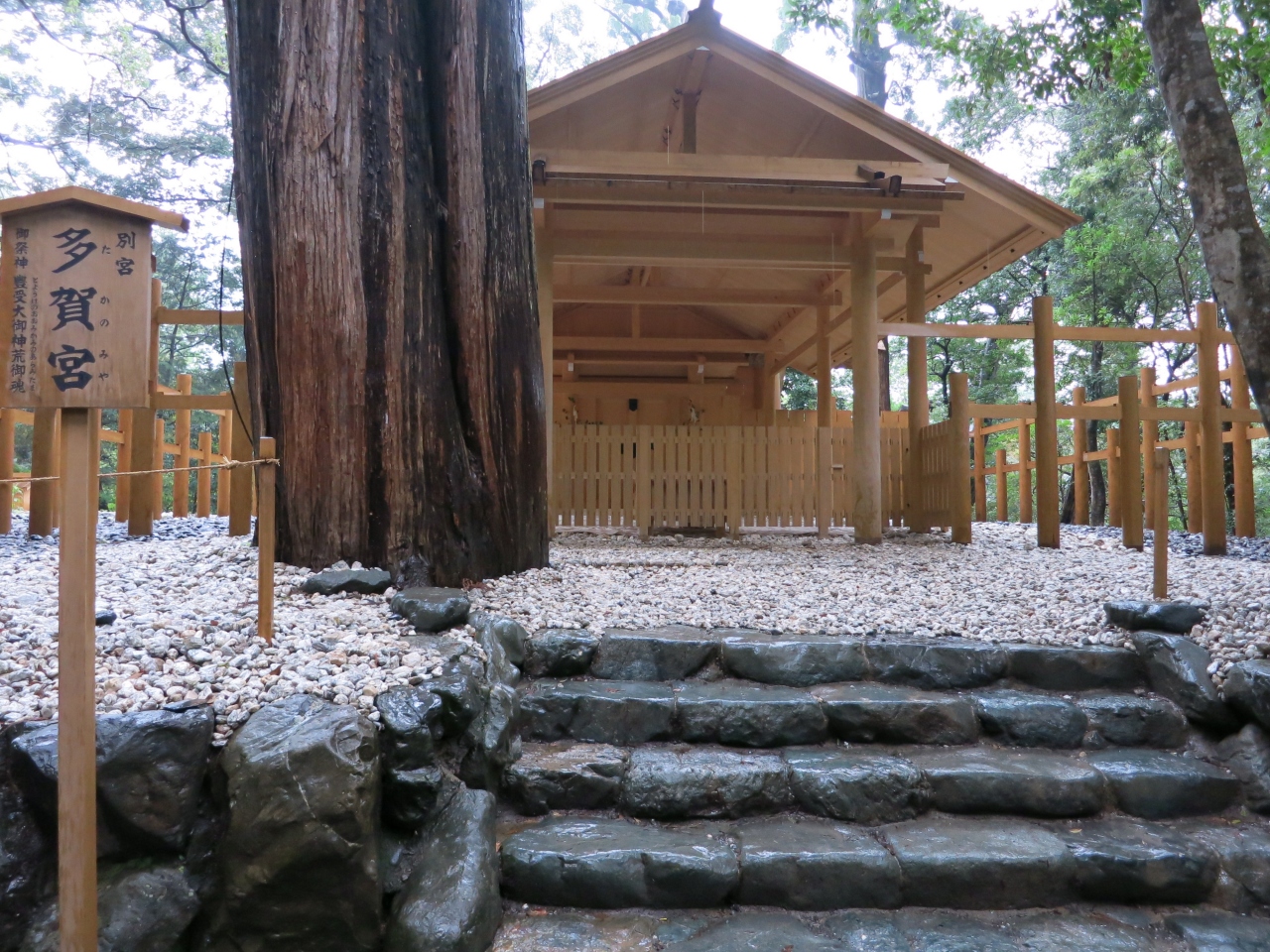 伊勢神宮外宮の亀石を渡り、風宮の先にある98段ある石段を左に回り込む様に高台に上った先に多賀宮があります。豊受大御神の荒魂である豊受大御神荒魂を祀っていることから、外宮の4つの別宮うちで最高位とされています。多賀宮の奥は深々とした鎮守の杜となっています。