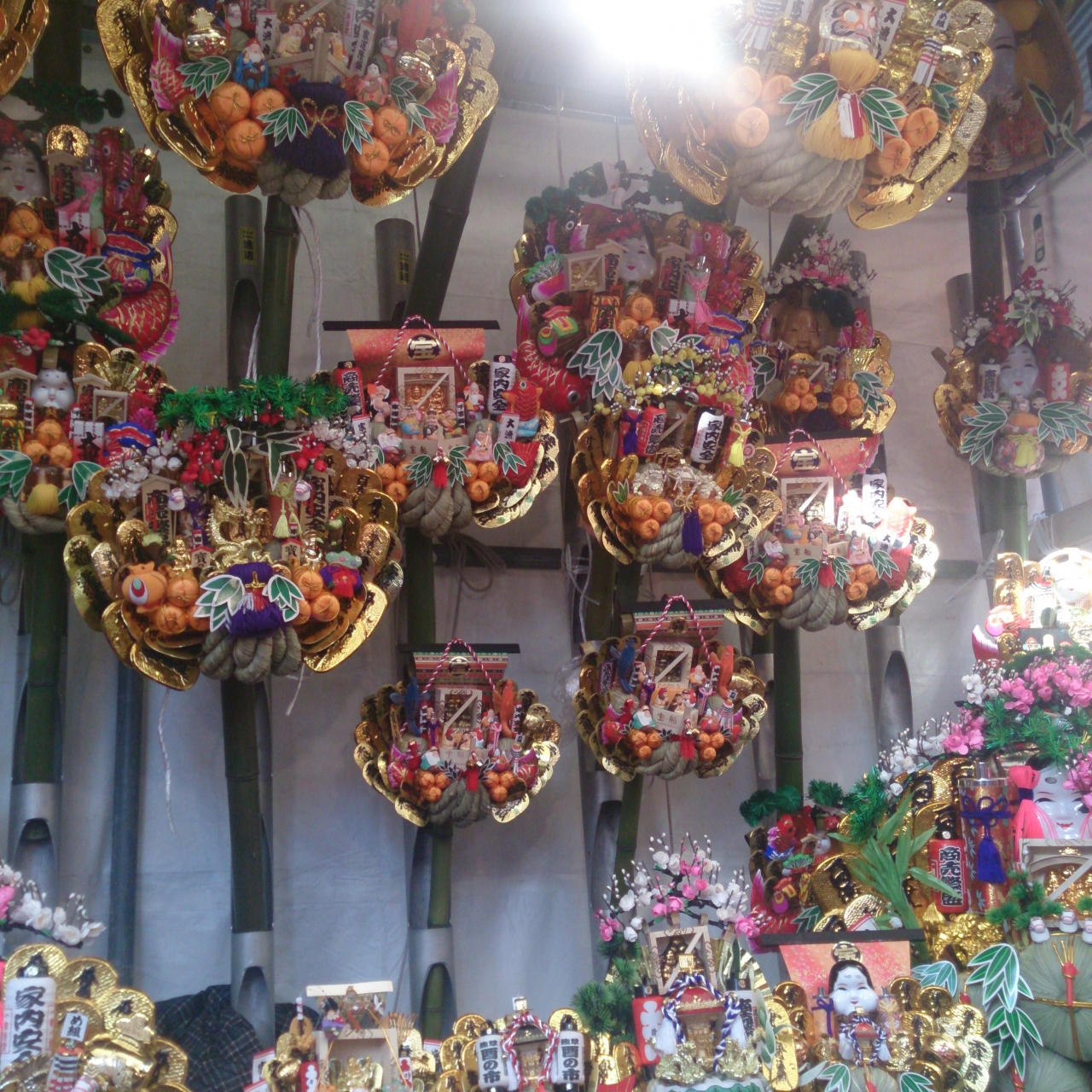 商売繁盛祈願の縁起物である熊手がずらーっと並びます。福をかき集めるのいう点から一般の方も購入されます。小さいものから10万以上の物まで、またお店ごとに飾り物に工夫を凝らしキャラクター熊手なども見かけます。