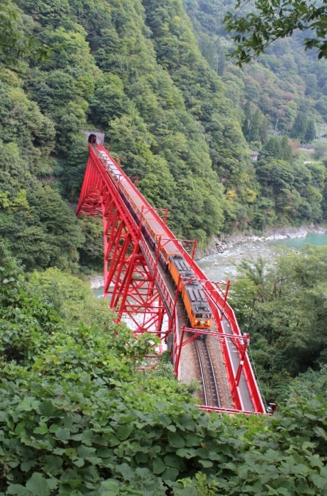 トロッコ電車の始発駅である宇奈月駅からすぐ近くにあるので、トロッコ電車乗車まで時間があれば是非立ち寄りたいところです。トロッコ電車がトンネルから出てきて黒部川に架かる赤い新山彦橋を渡るところが見られます。ここから撮影した写真がよく観光案内に使われています。展望台にはトロッコ電車の時刻表が掲示されていますのでいつごろトロッコ電車が新山彦橋を渡るか確認できます。