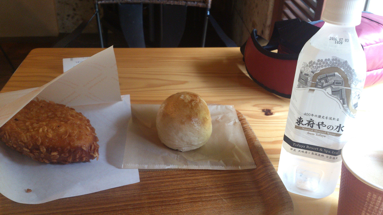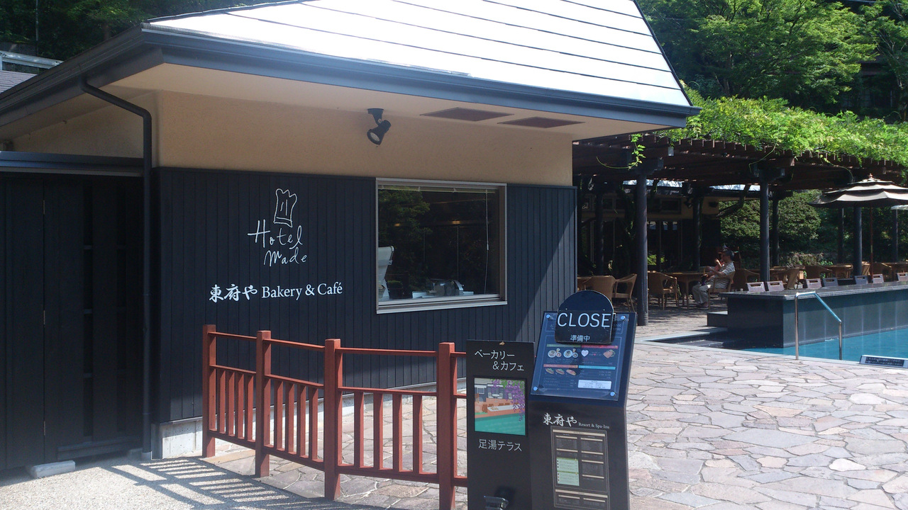 東府やリゾート内にあるイートイン付きベーカリーです。室内にも外にもテーブルがありますが、特徴は足湯席。ロングカウンターのしたに足湯が流れています。