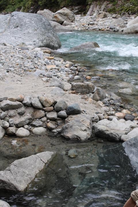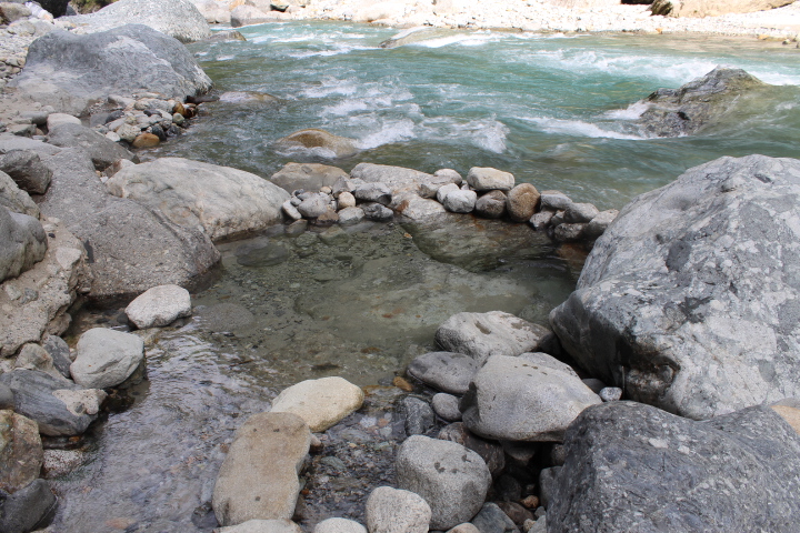 黒部峡谷トロッコ電車の鐘釣駅から急な階段を下りた河原にいくつもの温度の異なる露天風呂(足湯)があります。43度と表示のあった露天風呂(足湯)に浸かりましたが思ったほど熱くなく丁度良い温度でした。石壁を隔てて黒部川が流れ野趣満点の露天風呂(足湯)です。タオルを忘れずにお持ちください。但し、帰りの階段は結構キツイので覚悟してください。