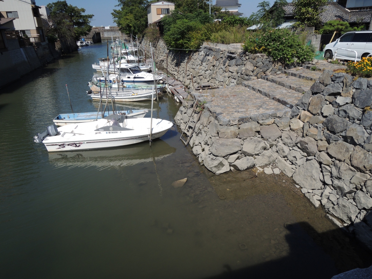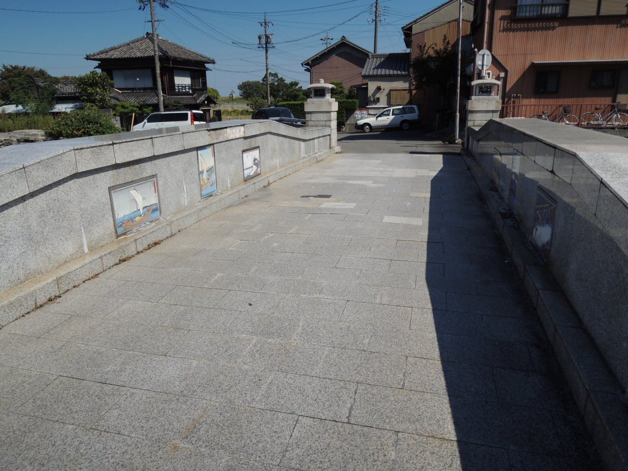 北大手橋には浮世絵の絵が数枚張られていて、この北大手橋から揖斐川に面する川口樋門から南大手橋に至る三之丸掘の石垣約500mが現存する城壁を間近に見ることができます。ただ船が係留されていて少し残念な景色になります。