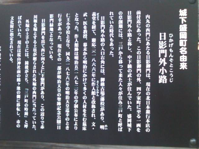 こちらのスポットは、町の観光パンフレットには載っていませんでしたので、ちょっと意識していないと見逃しがちの立地だと思います。日影門緑地と呼ばれる小さな緑地公園の前に解説板が設置されていて、御稽古場(藩校)として始まった明義堂に関する歴史が、淡々と綴られていました。