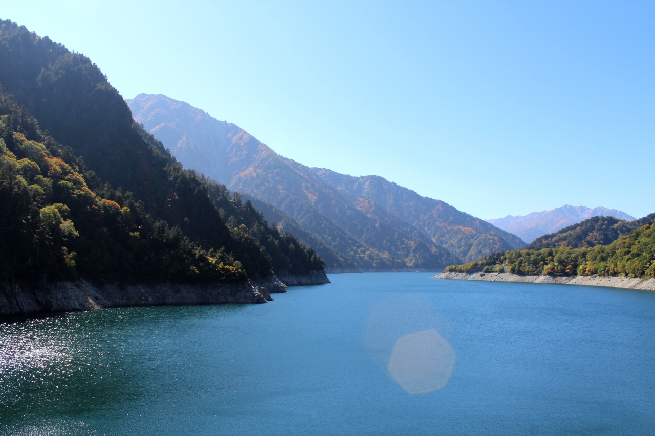 黒部湖は黒部ダムの完成により出来たダム湖ですが、周囲の景色に溶け込んでいいアクセントになっています。黒部ダムえん提からの眺めもいいですが、大観峰の展望台から見た後立山連峰の前面に映える眺めも最高です。
