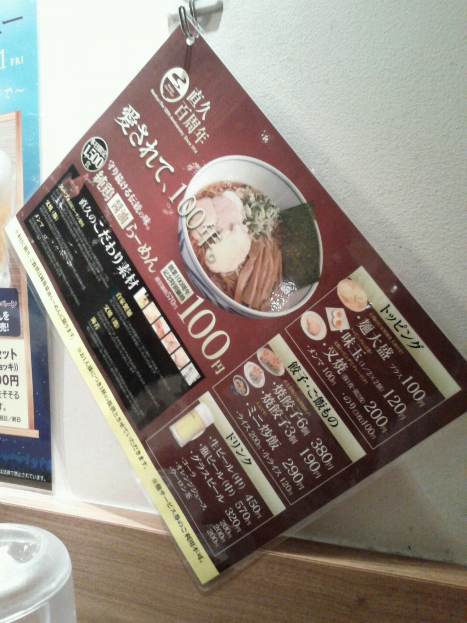 100周年記念とのことで醤油ラーメンが1日限りではありましたが通常料金570円のところ、100円と破格な値段でした。