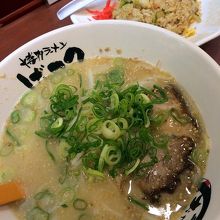 で、博多ラーメン590円(消費税8%込み)と半ちゃんセット+180円(消費税8%込み)にしました。
