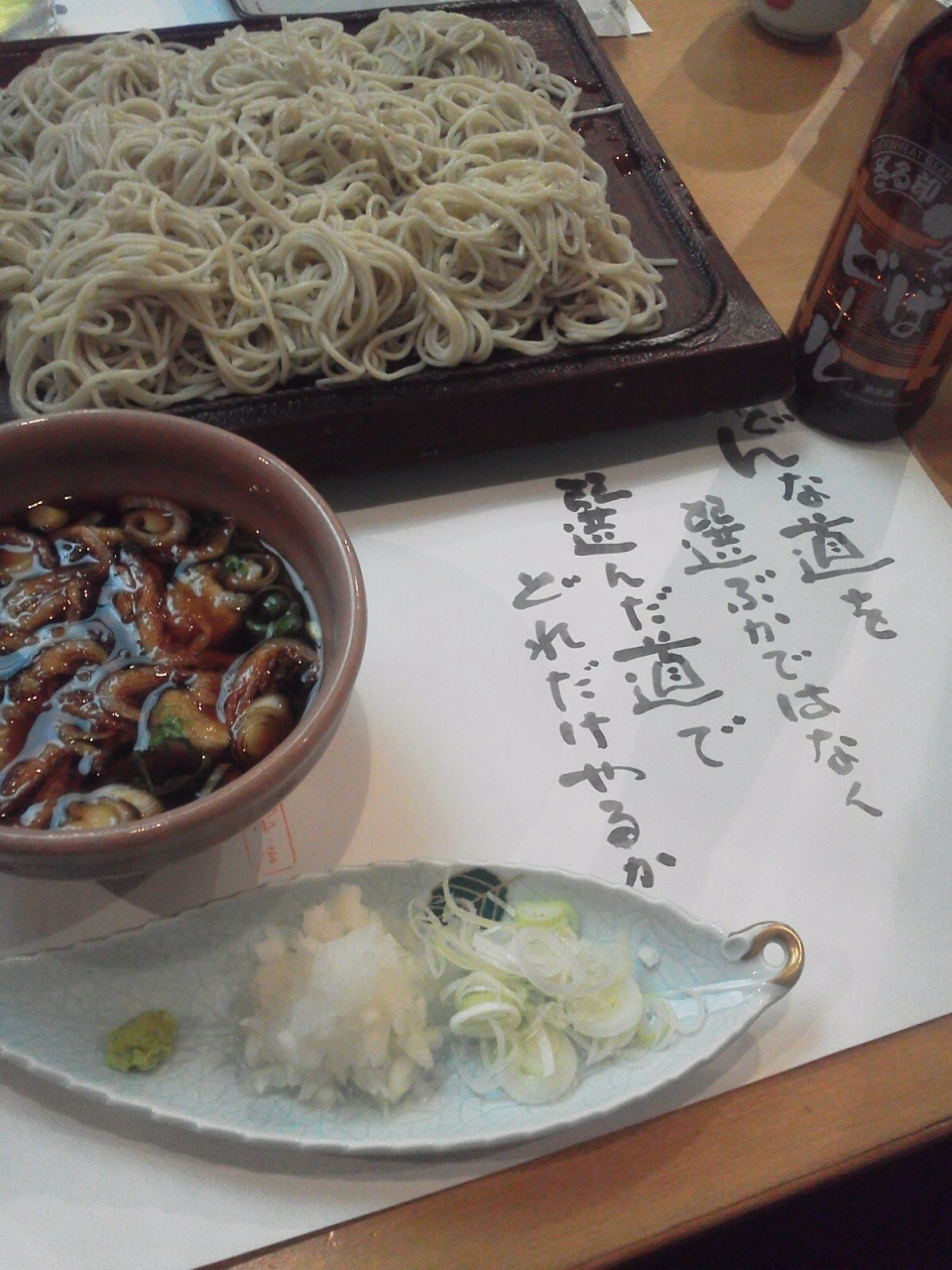 2.5人前の板そばを、それぞれ好みのつゆで食べました。桜海老のさくら汁やきざみ鴨汁などが選べます。わさびを使った3種のおつまみもおいしい!そして、カレーうどんでも有名なお店です。テーブルに敷いてある和紙のテーブルクロスに書かれた言葉も奥が深くて、ついつい毎回写真におさめてしまいます。横浜駅からだと少し距離がありますが、地下鉄ブルーラインの高島町駅、京急線の戸部駅からだと近い場所にあります。