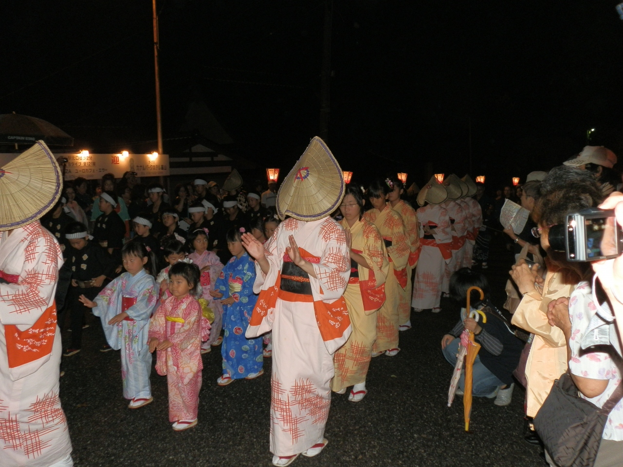 - おわらは町流しと言って町内を踊る。観客は道路の両脇に寄り、邪魔にならないように見る。従って、混雑は仕方がない。