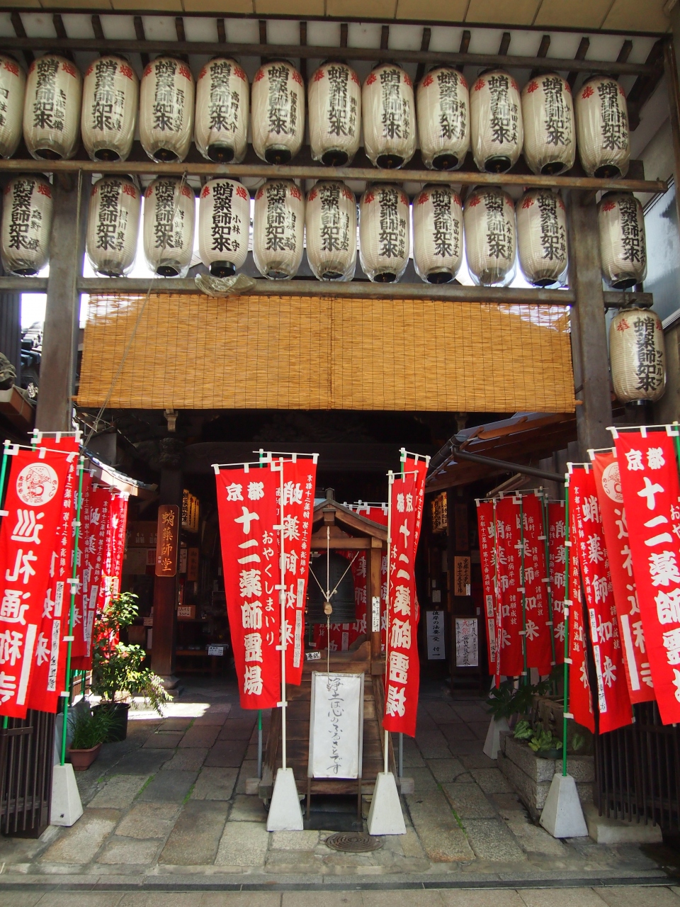 京都随一の商店街「新京極」の中に突如現れる赤い旗と提灯の寺。
