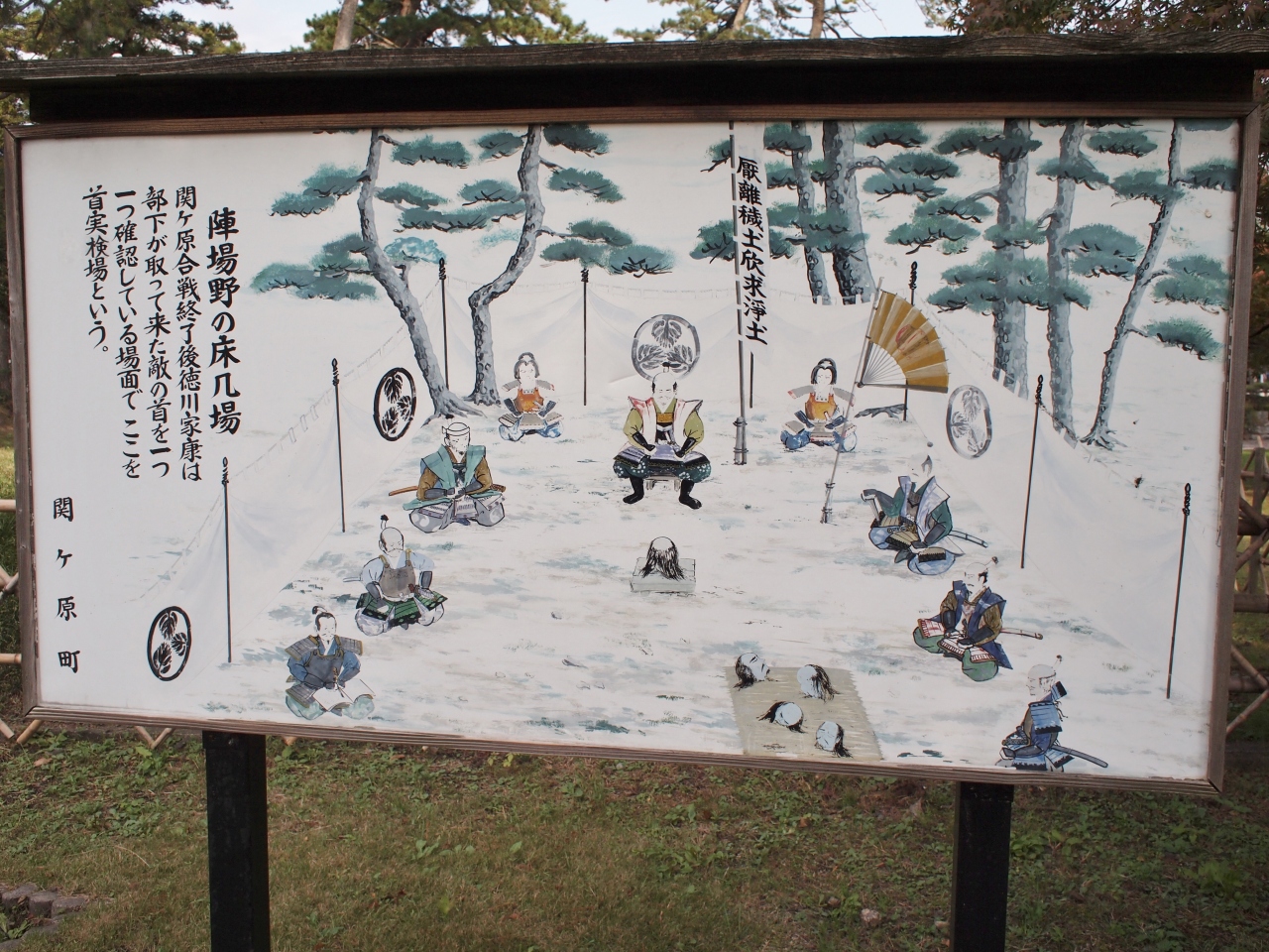 東軍の徳川家康が最終的に布陣した場所で、合戦の後はここで首実検も行ったそうです。今はモニュメントのある公園になっていて、2つの神社、観音像、霊園などもあります。観光客も多く、関ヶ原町歴史民俗資料館も隣接しています。