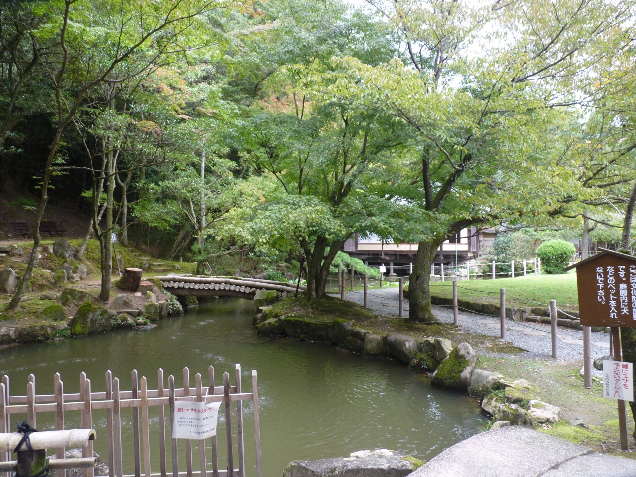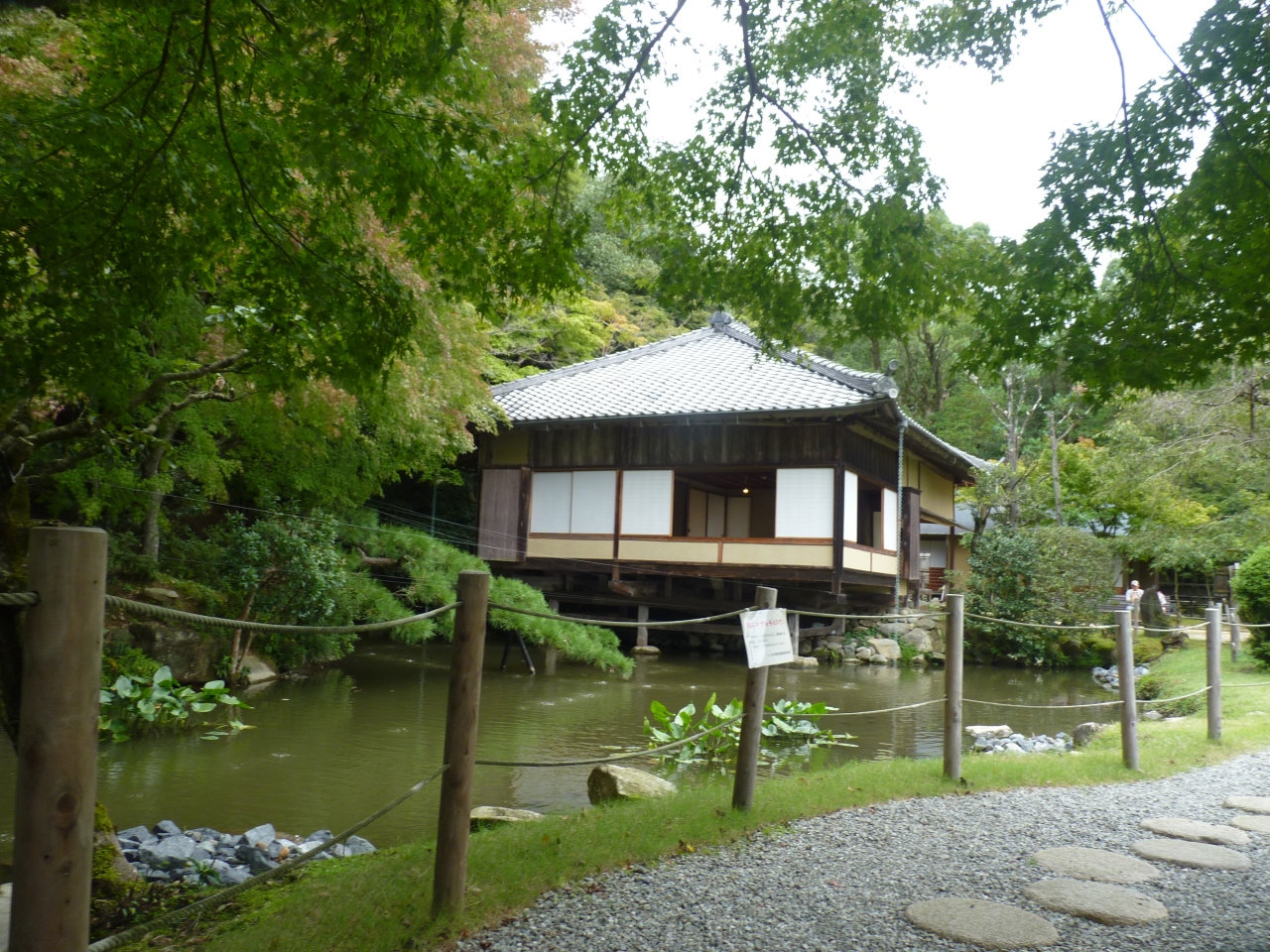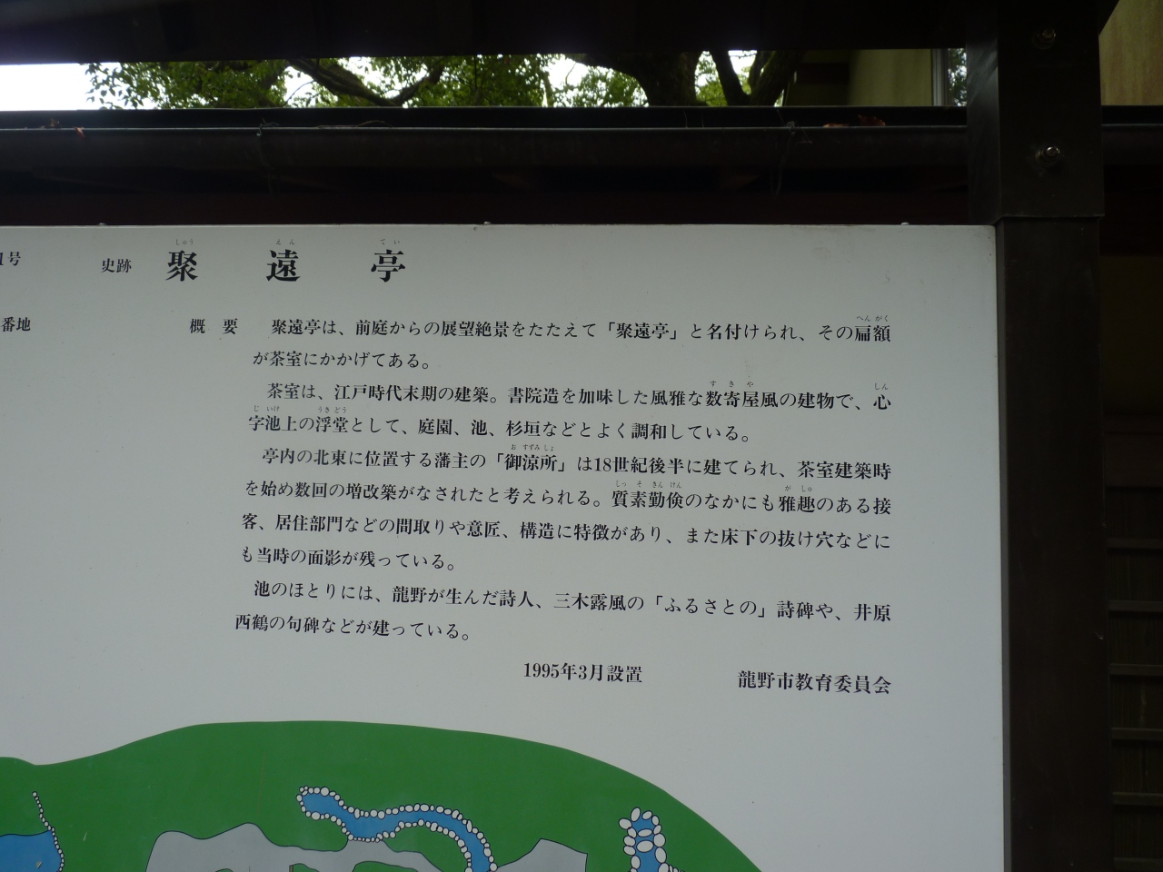 ここからの眺望絶佳をたたえて「聚遠の門」と呼ばれてから聚遠亭と名づけられたと伝えられている。心字池の上にある茶室は、庭園、池、杉垣根などと調和した書院造りを模した数奇屋風で、市指定文化財になっている。万が一のことを考えこの茶室には抜け穴があると聞く。