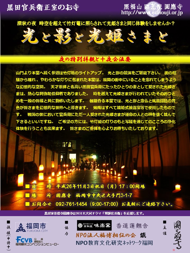 去年、参加してとても良かったこのイベントが今年も開催されるそうです。官兵衛の愛妻、光姫さまがされていた法要を現代によみがえらせた法要なのですが、ろうそくの灯りでのライトアップのせいか、どこか不思議な空間に迷い込んだような雰囲気でした。おいしかったみつ姫呉豆腐もまた出されるようで、そちらも楽しみです。見て、聞いて、味わって、数時間でいろんなことを体験できる催しだと思います。秋の夜長に非日常体験はいかがでしょう?